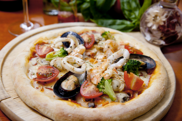 魚介類をふんだんにトッピング。ムール貝、いか、エビ、ほたて、あさり、サーモン。チーズが見えないくらい魚介がぎっしり!魚介の旨みたっぷりのピザに仕上げました!これを食べたら、トッピングの寂しいシーフードピザには戻れません!